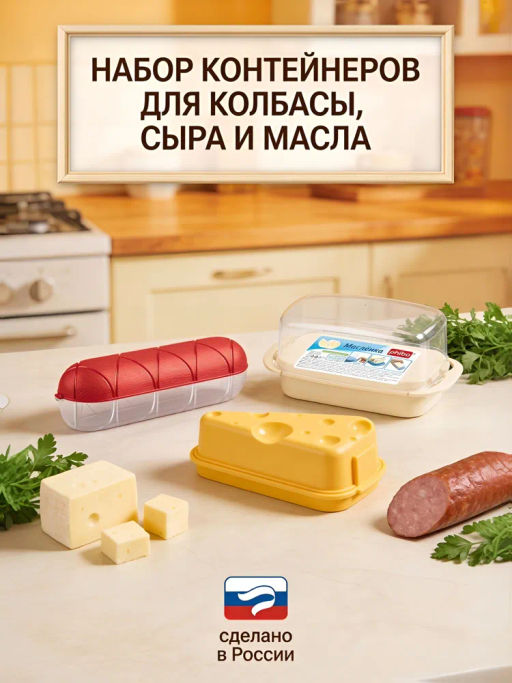 Набор контейнеров (для колбасы, для сыра и для масла) станет отличным подарком для Вас и Ваших близких. Колбасы различных сортов дольше сохранят свежесть и аромат в специальном контейнере. Плотная крышка дольше сохраняет свежесть колбаски и предотвращает её засыхание. А корпус, повторяющий цвет и фактуру настоящей колбасы и заводскую вязку, стильно впишется на полки в холодильнике хозяйки. Сыр. В стилизованном под натуральный продукт контейнере удобно хранить и подавать на стол различные сорта сыра как куском, так и ломтиками. Контейнер плотно закрывается, защищая сыр от посторонних запахов и предотвращая его высыхание. Масленка состоит из основания с двумя ручками-фиксаторами и прозрачной крышки, которая защищает содержимое от посторонних запахов. Закрытую масленку можно переносить, держа за крышку, которая надежно удерживается боковыми фиксаторами. После нажатия на фиксаторы крышка легко снимается. Благодаря мерной шкале с делениями по 50г, нанесенной на основание масленки, удобно отмерять кусочки масла, а отсутствие бортиков на основании позволяет легко отрезать их ножом. На рифленой поверхности основания не остаются царапины от ножа.