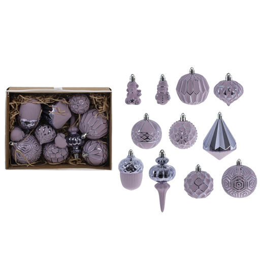 Подарочный набор из 12 фиолетовых новогодних украшений, выполненных в технике состаривания, представляет собой коллекцию изысканных деталей, придающих праздничный шарм и особую атмосферу праздника.
