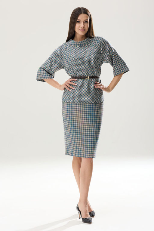 Стильный комплект, состоящий из блузона и юбки, из костюмной ткани. Блузон прилегающего силуэта, слегка расклешён к низу. Спинка со средним швом. В среднем шве спинки потайная застёжка-молния. Длина по спинке 56,5 см. Горловина обработана стойкой воронкой, высотой- 3,5 см. Рукав реглан, слегка расклешён к низу. Длина рукава 41,5 см. Юбка прилегающего силуэта, зауженная к низу, по среднему шву потайная застёжка на тесьму молнию, в низу разрез. Верхний край обработан обтачкой. Длина юбки по боковому шву 64 см. Юбка на подкладке. Декор ремень, может отличаться от заявленного на фото.­