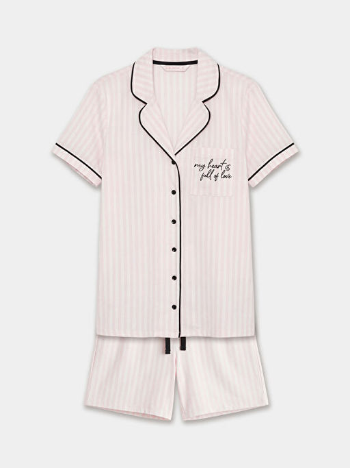 G?mlek Yaka ?izgili Kad?n ?ortlu Pijama Tak?m?