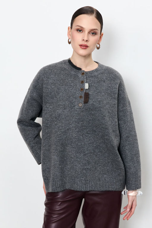 Этот джемпер свободного силуэта станет вашим любимым элементом гардероба. Длинные рукава со спущенной проймой добавляют расслабленности. Круглый вырез горловины, низ изделия и низ рукава оформлены резинкой. Изюминка этой модели элегантная застежка поло спереди, украшенная декоративными элементами, которая придает джемперу особый шарм. Изделие выполнено из мягкой пряжи.
