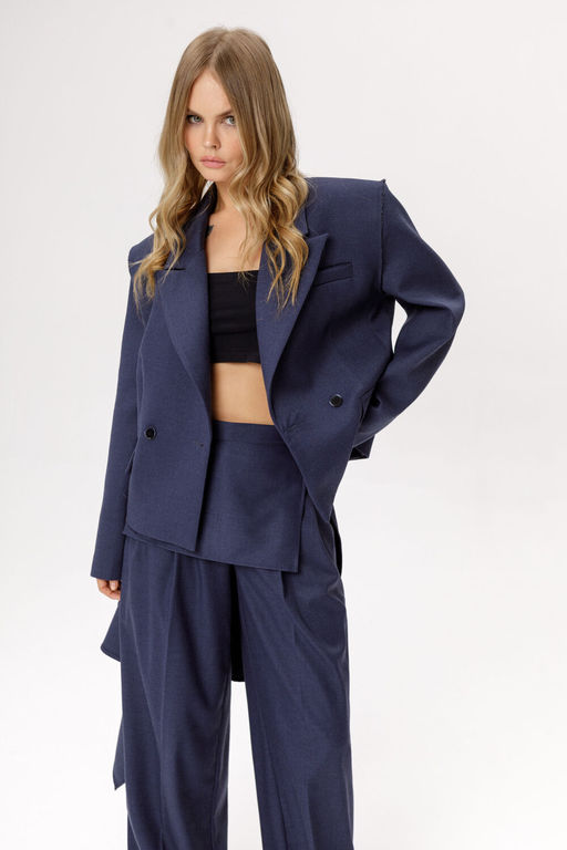 Детали: жакет прямого силуэта, пиджачный воротник, двубортная застежка на две петли и пуговицы, функциональные карманы, спинка с фигурной кокеткой, рукава втачные, жакет на подкладке.