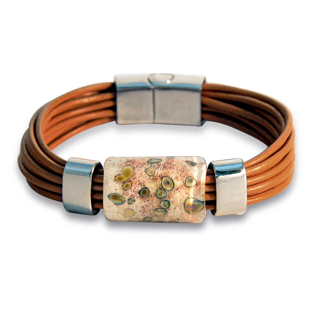 Браслет изготовлен из муранского стекла, натуральной кожи и гипоаллергенной ювелирной стали, что очень важно для людей с чувствительной кожей. Металл не темнеет и не подвергается воздействиям окружающей среды, надолго обеспечивая красивый внешний вид изделия. Крепкий магнитный замок с двойной защитой надежно фиксируется на запястье. Ширина браслета - 1,5 см. Размер стеклянной бусины - 1,9x2,5 см. Вес - 30 гр.