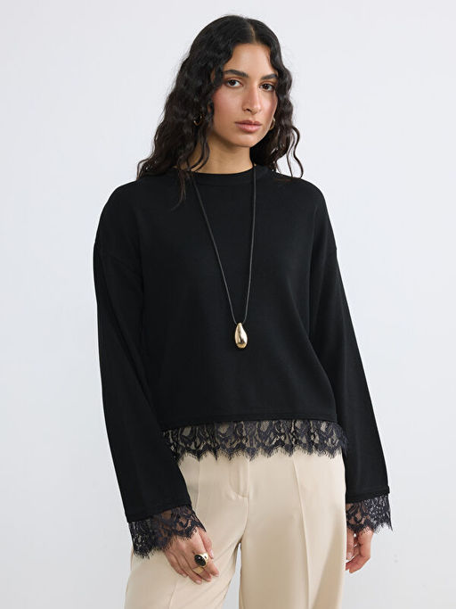 Bisiklet Yaka Dantel Detayl? Kad?n Kazak