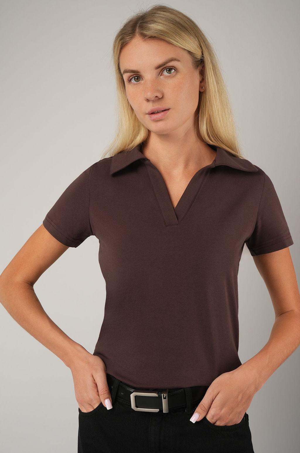 Коричневая футболка поло из трикотажа кулирная гладь выполнена в лаконичном дизайне: прямой крой, отложной воротник и V-вырез добавляют изящности. Хлопковое поло подойдет для похода в офис, на прогулку и для дома.