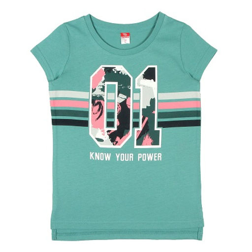 Футболка прямого силуэта с короткими рукавами и разрезами по бокам. Горловина круглая, обработана притачной бейкой из рибаны с эластаном. Перед декорирован принтом.