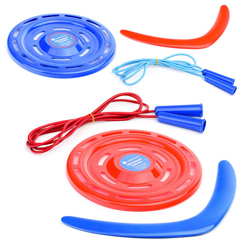 • Комплектация: бумеранг (38см.), летающая тарелка (22 см.), скакалка гимнатсическая (2,5 м.).