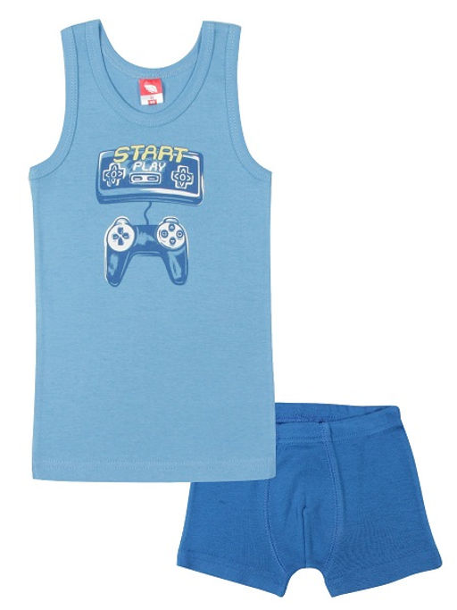 Комплект из трусов-боксеров и майки. Горловина и проймы майки обработаны окантовкой из основного полотна. Перед оформлен шелкографией. Верхние и нижние срезы трусов-боксеров обработаны плоским швом вподгибку. По верху одновременно проложена резинка. Швы притачивания вставки и ластовицы спереди оформлены декоративной строчкой в цвет основы.