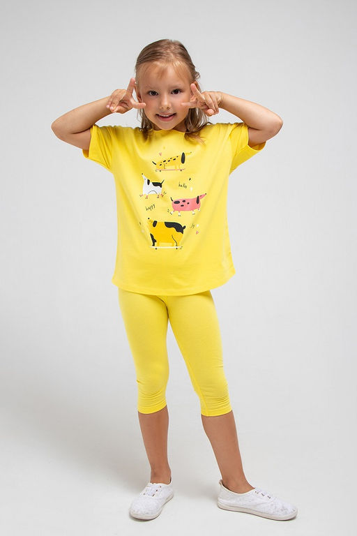 Укороченные лосины с поясом на резинке. Сшиты из набивного трикотажа супрем с эластаном в оттенке "сочный лимон". Эластан в составе делает изделие эластичным и позволяет избегать деформаций во время носки. Низ обработан плоскими швами.­