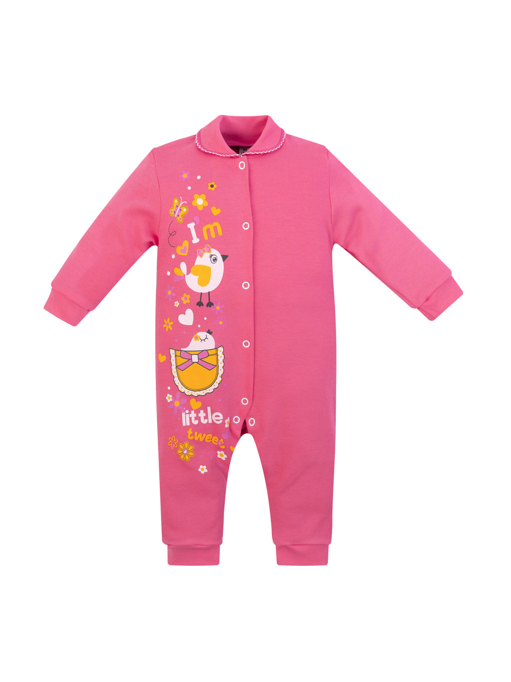 Трикотажный ясельный комбинезон пригодится малышам для носки в прохладные дни. Модель выпускается из гладкого и мягкого на ощупь интерлока. Изделие имеет отложной округлый воротничок, закрытые стопы на штанинах и манжеты на рукавах. Прочные кнопки-застёжки проходят по передней стороне комбинезона.