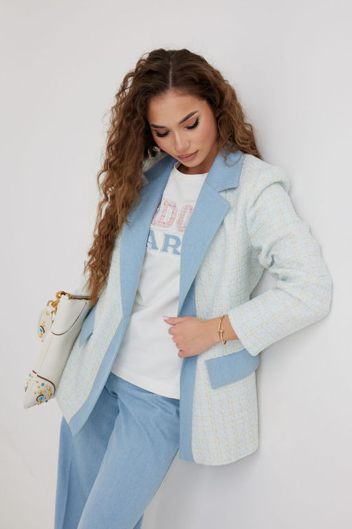 Жакет из полотна рогожка, полуприлегающего силуэта, с центральной застежкой на одну петлю и декоративную пуговицу. Перед с талиевой вытачкой и карманом с клапаном. Спинка с отрезным бочком, средним швом. Воротник пиджачный. Рукав втачной двухшовный. Воротник, лацкан с планкой, клапан и обтачка рукава выполнены из джинсовой ткани.   Жакет на подкладке с плечевыми накладками.