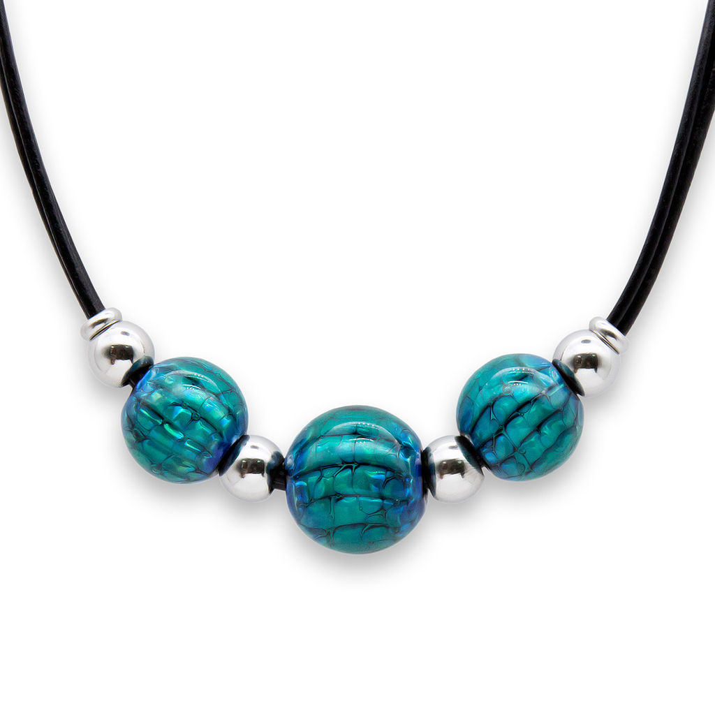 Колье изготовлено из натуральной кожи, муранского стекла и гипоаллергенной ювелирной стали, что очень важно для людей с чувствительной кожей. Металл не темнеет и не подвергается воздействиям окружающей среды, надолго обеспечивая красивый внешний вид изделия. Длина колье - 46 см + 5 см. удлиняющая цепочка. Диаметр шаров - 1,8 и 2,2 см. Вес - 46 гр.­