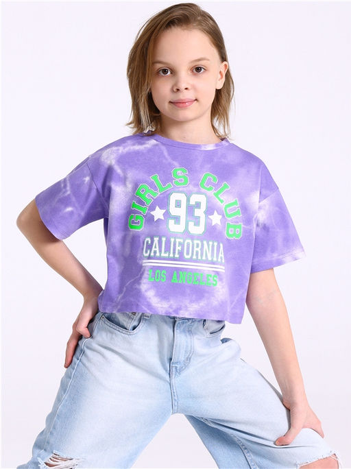 Уценка футболка,хлопок 100%,кулир / хлопок 100%,- / тай-дай на сиреневом / Клуб девчонок / - / - / -,Стильная укороченная футболка для девочки из кулира - легкого хлопкового полотна. Изделие с короткими рукавами со спущенным плечом, украшено ярким принтом. Отличный выбор для юной модницы! Уход: только машинная стирка (руками не стирать!) при температуре 40 градусов, без предварительного замачивания. Изделия с печатью и декором перед стиркой необходимо вывернуть на изнаночную сторону.
