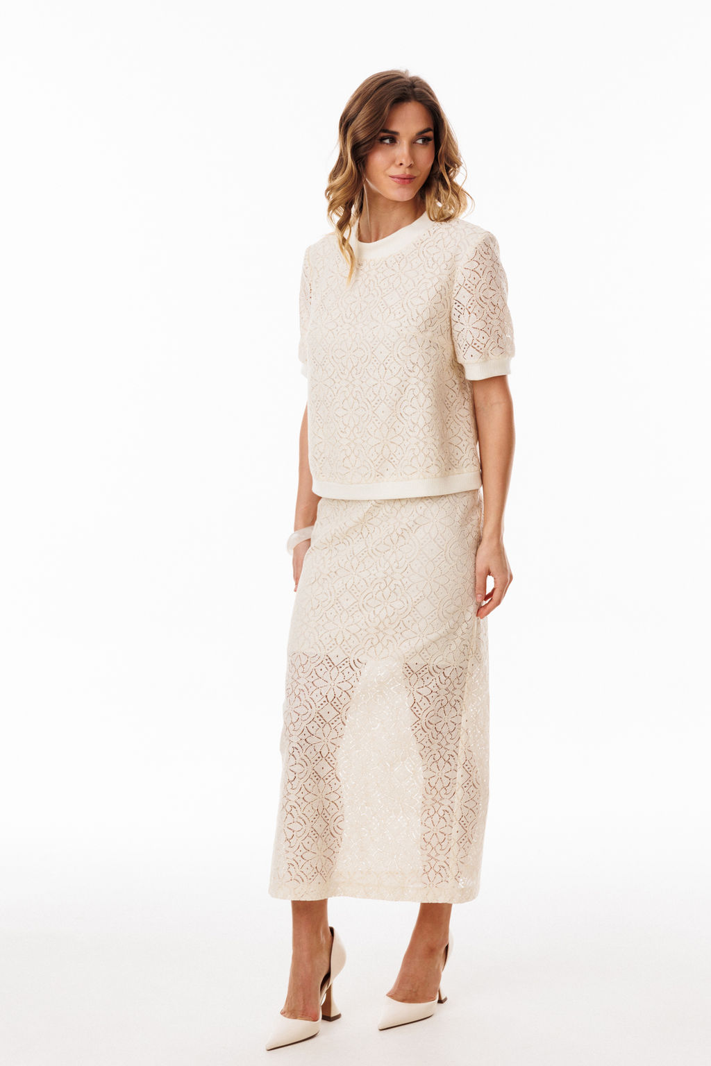 Комплект: блузка+юбка. Комплект выполнен из гладкокрашенной плательно-блузочной ткани "шитье". Блузка прямого силуэта, длиной выше линии бедер. По переду обработаны нагрудные вытачки. Горловина округлой формы, обработана бейкой. Рукав втачного покроя, одношовный, с манжетой по низу, длиной выше линии локтя. Низ блузки обработан притачным поясом. Бейка горловины, манжеты рукавов и пояс низа выполнены из отделочного материала "довяз". Перед и спинка на притачной по низу подкладке. Юбка прямого силуэта, длиной выше линии щиколотки, на притачном поясе, застегивающимся на пуговицу. На заднем полотнище обработаны талиевые вытачки и средний шов с разрезом и застежкой на потайную молнию. Юбка на отлетной по низу подкладке.