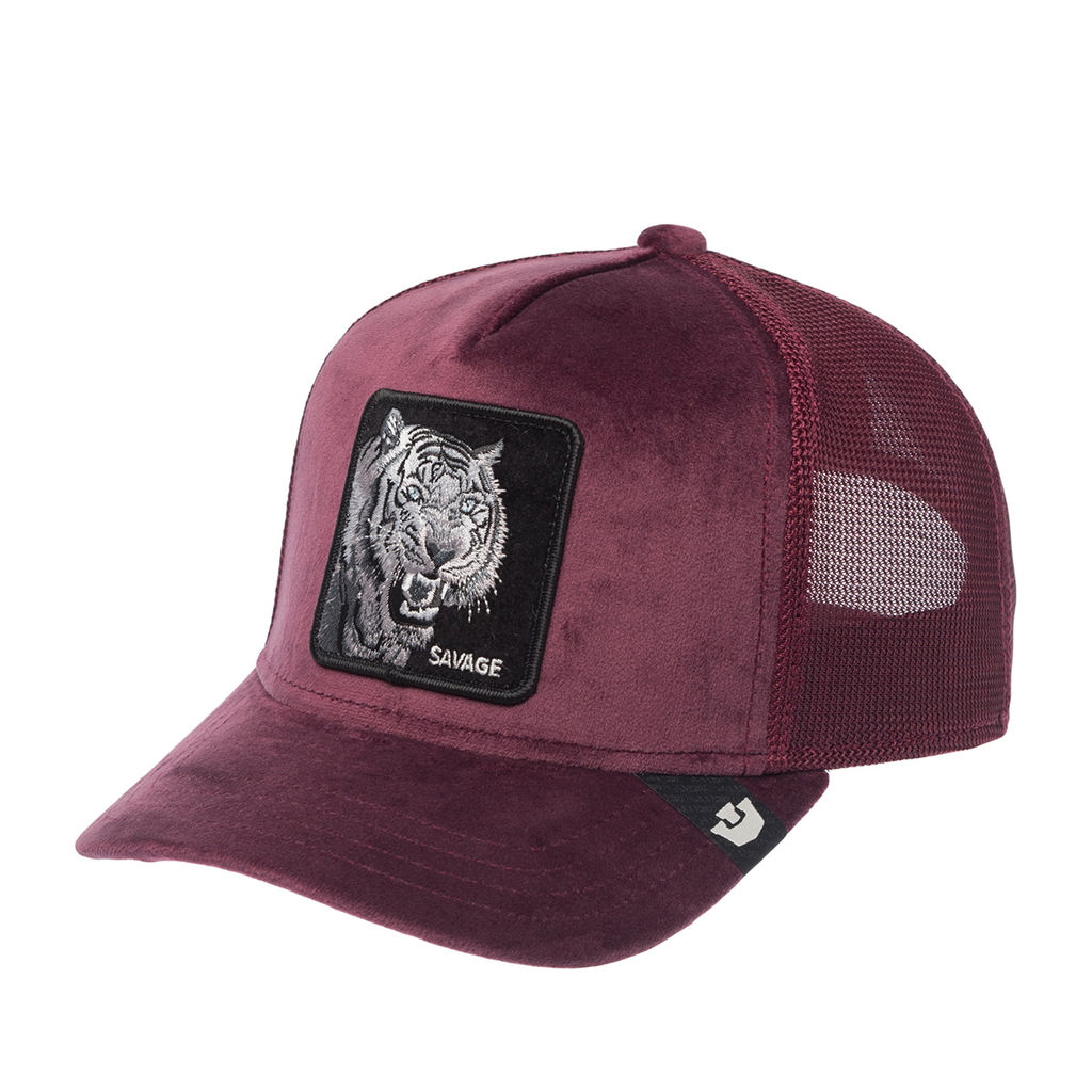 Бейсболка с плотной сеточкой с тигром от американского бренда Goorin. Передняя часть бейсболки - из бархатистого материала. На структурированной панели - черный бархатистый патч с детализированной вышивкой изображения разъяренного дикого тигра и надписи Savage. На сленге так говорят про кого-то, кто делает что-то экстремально хорошо или слишком суров. Goorin - это язык продвинутых пользователей моды с прокачанной самоиронией. На изогнутом козырьке - тканевый ярлычок с логотипом бренда в виде средневекового замка. Изнанка козырька - из бархатистого серо-голубого материала. Внутри - лента по окружности для комфортной посадки. Размер регулируется с помощью пластиковой брендированной застежки. Длина козырька – 6,5 см, глубина бейсболки – 12 см. Изнанка передней панели обшита шелковистой бордовой тканью. Команда бренда в своих коллекциях с 2025 года обновила систему защиты от подделок: брендированные швы и измененный дизайн фирменного ярлычка и нашивки внутри.