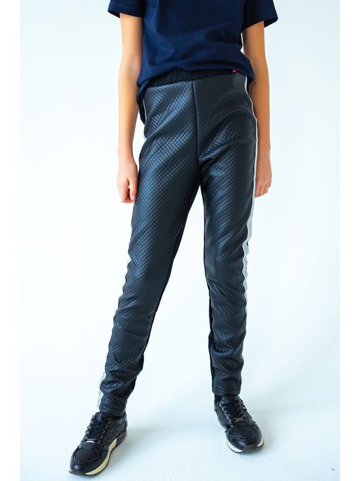 Леггинсы для девочки прилегающего силуэта из тканей компаньонов. Пояс на резинке. По боку-лампас. Состав:48% хлопок, 44% полиэстер, 8% лайкра