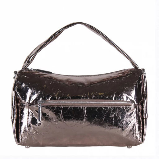 Базовая модель выполнена из натуральной кожи. Дополнена серебристой фурнитурой. Данная модель закрывается на молнию, носится в руке или на плече. В комплекте есть ремень съемный с регулировкой длины.  Каркас полужесткий. На дней предусмотрены ножки.