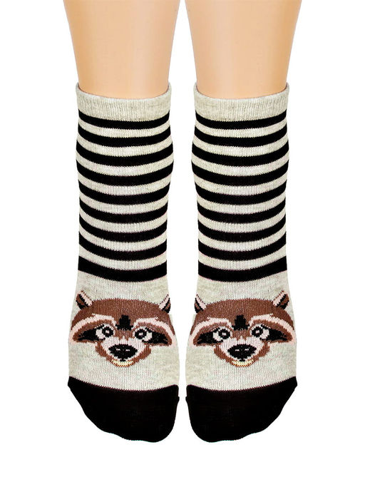 Детские полосатые носки. В основе пряжи высококачественный гребенной хлопок, за счёт чего ножкам комфортно и уютно на протяжении дня. Контрастную полоску дополняет мордочка енота, которая непременно порадует и впечатлит ребёнка. Такие носочки станут незаменимым атрибутом гардероба в любую погоду.