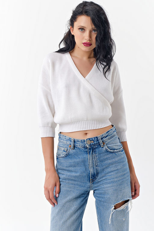 Особенности:  Вязаный укороченый джемпер с запахом с содержанием хлопка. Низ изделия и рукава оформлены резинкой в рубчик.