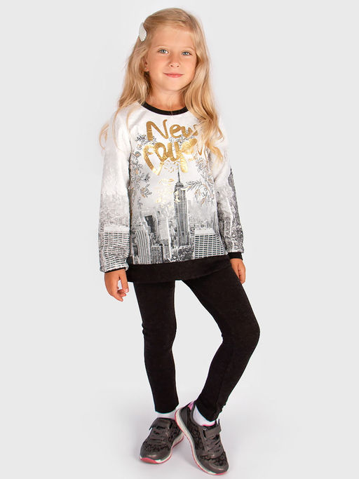 Комплект из туники с длинным рукавом на манжете, и лосин для девочки. Практичный и удобный вариант для прогулки или повседневного образа.