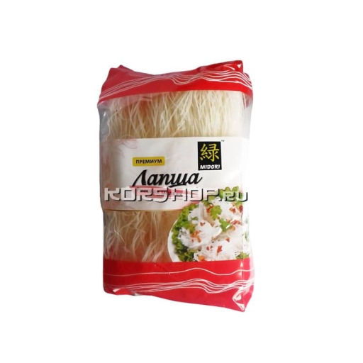 Рисовая лапша т.м. Midori качественная тонкая лапша из рисовой муки, в сечении прямоугольник 0.2ммх0.8мм. После варки становится белой.