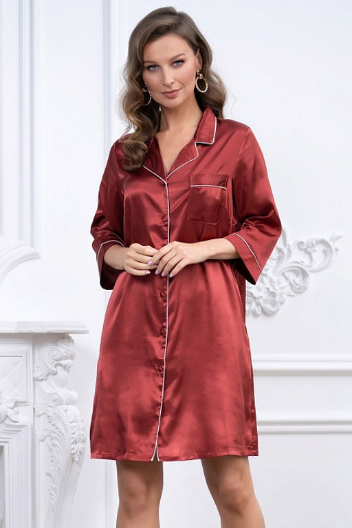 Рубашка Mia-Mella с центральной застежкой на пуговицах с рукавами длиной 3/4, выполнена  из искусственного шелкового полотна с атласным блеском. Низ рукавов, борт и воротник обработаны атласными кантами.­