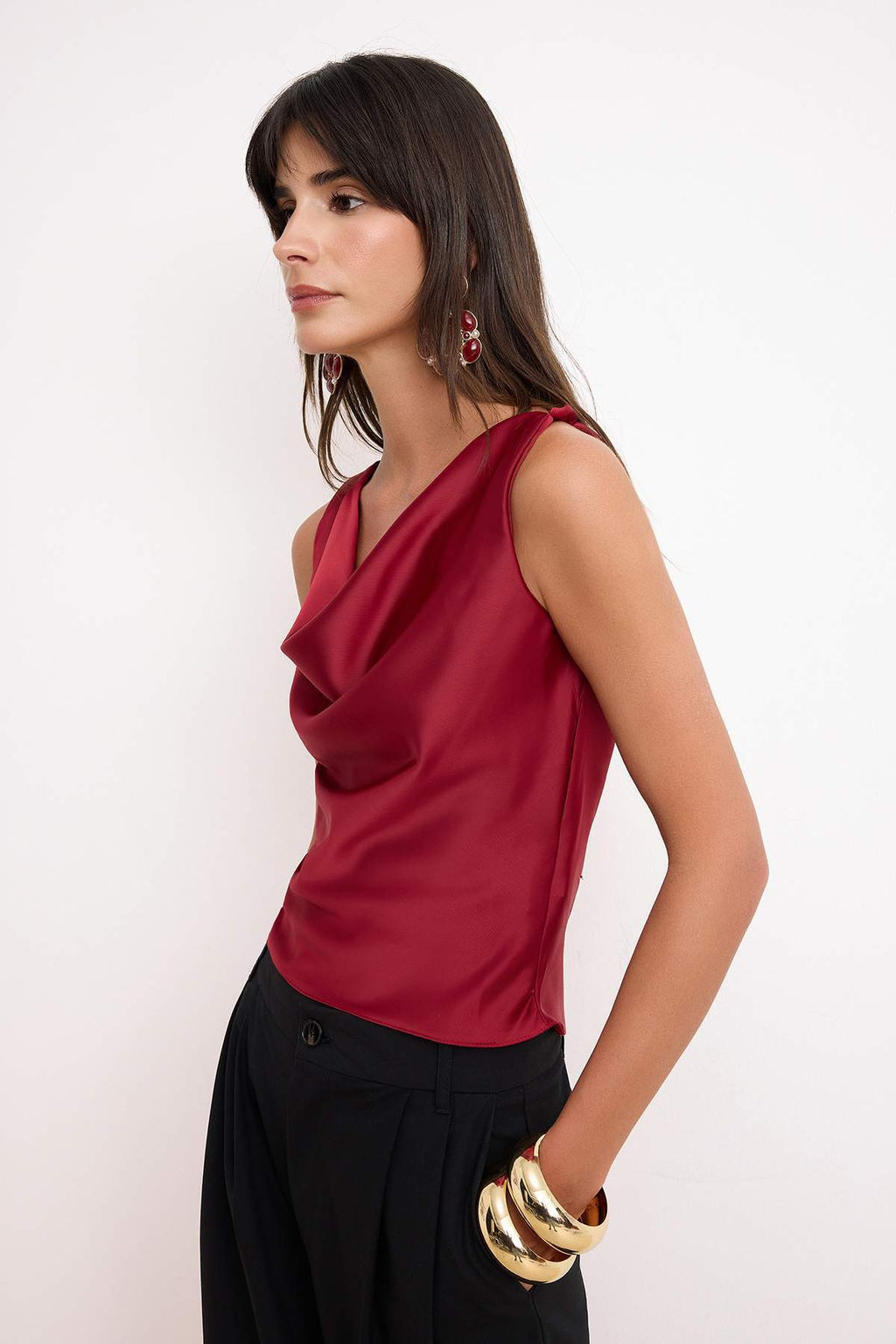 • K?rm?z? Duz Degaje Yaka Kolsuz Dokuma Saten Bluz TPRSS26BZ00069