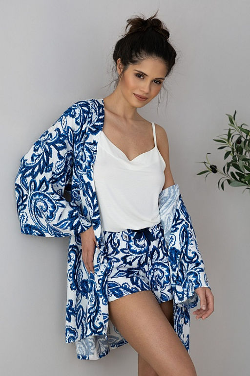 Необычный халат Donata с широкими рукавами и роскошным контрастным принтом. Крой свободный. В комплекте идет пояс, который идеально подчеркнет линию талии. Халат отлично подойдет для домашнего отдыха. Красиво сочетается с пижамой Donata. Состав:вискоза 100% Страна:Польша