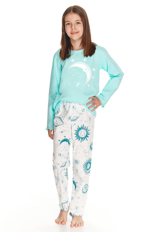 Хлопковая пижама для девочек Livia. Пижама выполненная из качественного и мягкого хлопка, состоит из кофты бирюзового цвета и брюк. Кофта свободного кроя, с длинными рукавами и круглым вырезом горла, брюки прямые с мягкой резинкой в поясе. Спереди кофта украшена милым принтом.­