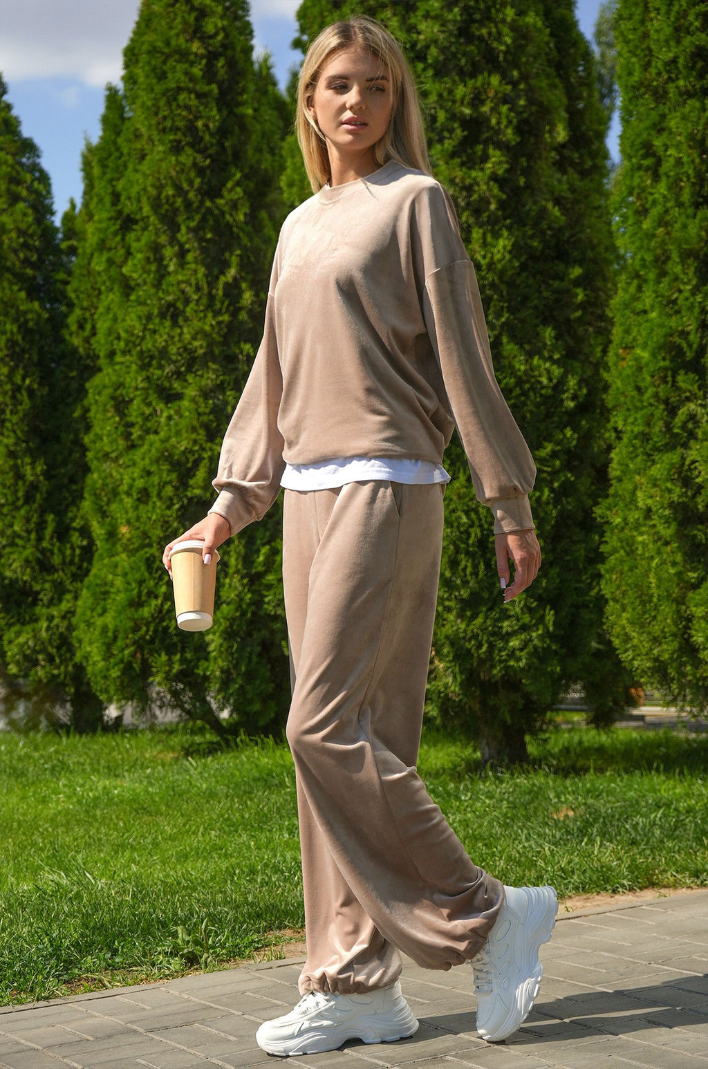 Повседневный велюровый костюм с брюками имеет свободный прямой крой и удобен для дома и прогулок. Бархатный костюм подойдет для путешествий и домашнего уюта.