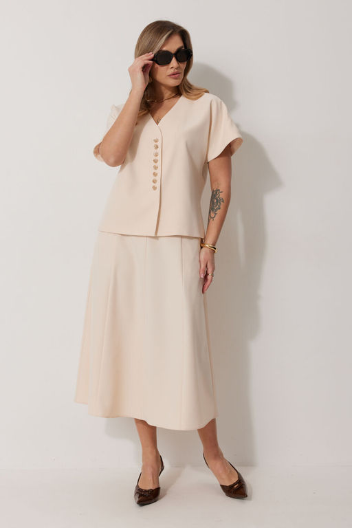 Костюм женский, состоящий из жилета и юбки. Жилет прямого силуэта на подкладке со спущенной линией плеча длиной до линии бедра. Спинка с центральным швом. Горловина V-образной формы обработана подбортом с обтачкой. Застежка жилета центральная на  декоративные пуговицы. Юбка на подкладке женская А силуэта длиной до середины икры. Перед юбки состоит из 4 клиньев. Вверху передней части юбки располагается карман с отрезным бочком. Спинка юбки состоит из 4 клиньев. По среднему шву юбки находится застежка молния.  Верхний срез юбки обработан обтачкой.