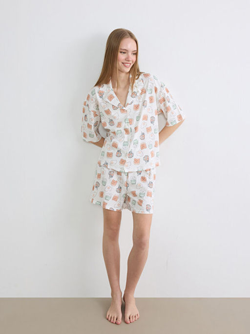 G?mlek Yaka Desenli Kad?n ?ortlu Pijama Tak?m?
