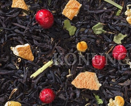 Индийский черный чай, пропитанный тонким ягодным ароматом с добавлением мяты, зверобоя, крапивы, ромашки, эхинацеи, ягод брусники и цедры лимона.