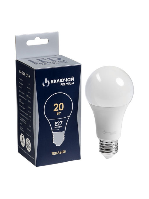 • Лампа светодиодная Включай, А65, 20 Вт, E27, 1900 Лм, 3000K, IP20, свечение тёплое белое, матовое ст