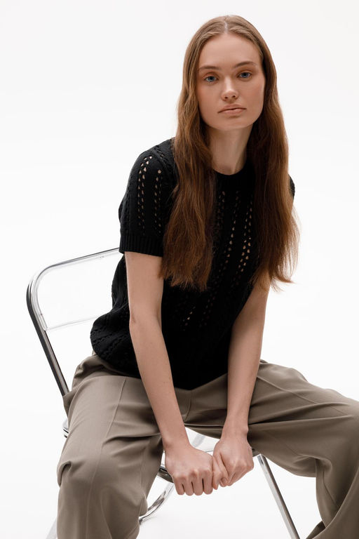 Джемпер из итальянской хлопковой пряжи выполнен ажурной, воздушной вязкой. Черный цвет и фактура делают его универсальным для различных образов.. Состав: 50% хлопок, 50% акрил