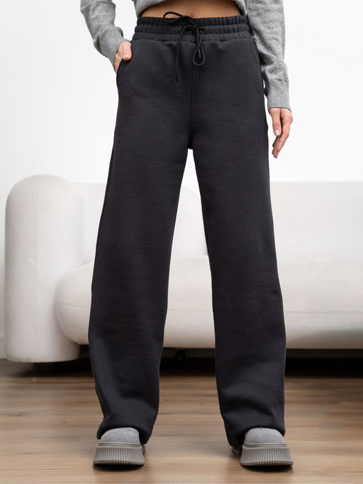 Трикотажные брюки с кулиской на талии. Штанины прямые, в боковых швах имеются внутренние карманы.