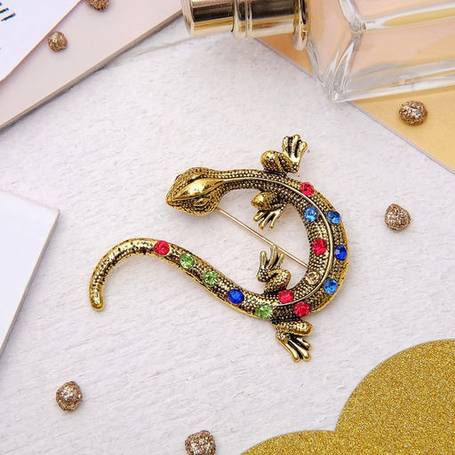 • Брошь со стразами «Ящерица», разноцветная в чернёном золоте