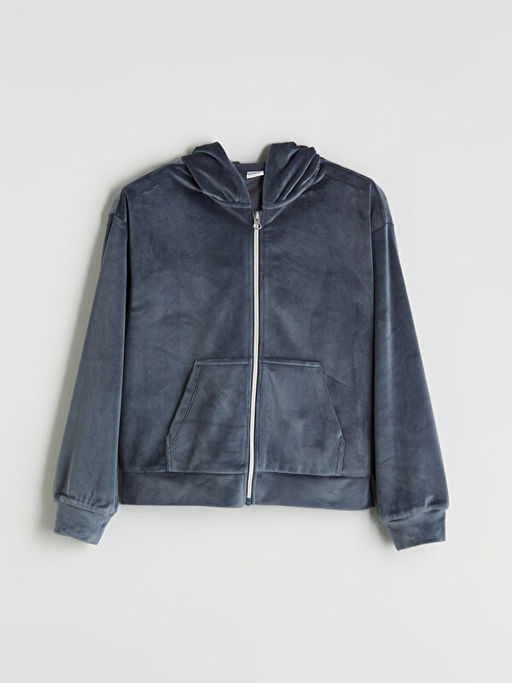 • Kap??onlu K?z ?ocuk Kadife Fermuarl? Sweatshirt