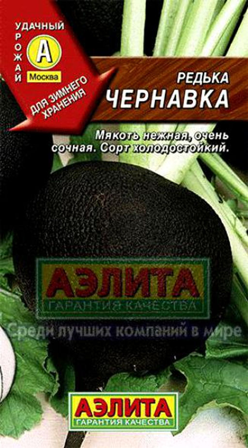 Высокоурожайный позднеспелый сорт (90-100 дней от всходов до технической спелости). Корнеплод округлый, черный, масса 240-260 г, диаметром 8-10 см. Мякоть белая, нежная, очень сочная. Ценность сорта: высокая урожайность, выравненность корнеплодов, хорошая лежкость, устойчивость к низким температурам. Идеален для салатов и длительное время не теряет свои вкусовые качества.