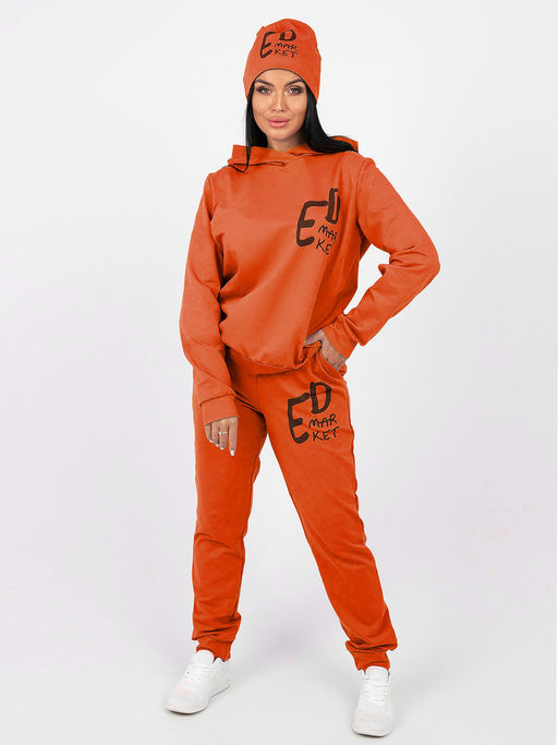 Молодежный спортивный костюм из футера 2х-нитки, состоящий из толстовки, брюк и шапки. Толстовка прямого силуэта, с капюшоном, рукава и низ на манжете. Брюки прямые, с боковыми карманами, удобный пояс на резинке, низ на манжете. На толстовке и передней части брюк контрастная печать. Завершает образ стильная шапка с печатью по центру.