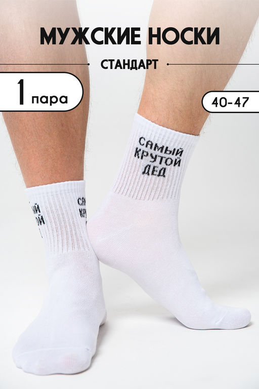 Комплект мужских носков одна пара. Широкая резинка по всей верхней части носка. На резинки надпись самый крутой дед