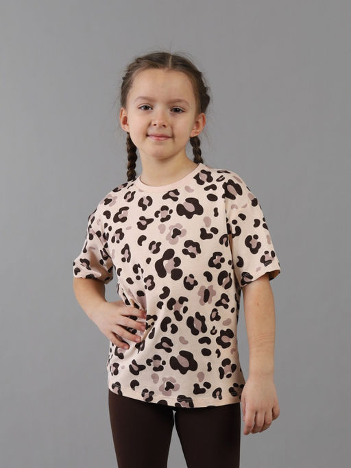 Футболка  из набивного натурального 100% хлопка. Свободный крой oversize трендовый силуэт и модный леопардовый принт, круглый вырез горловины, короткие рукава со спущенной линией плеча. Воротник из рибаны. Футболка сочетается с классическими джинсами, спортивными брюками и шортами. Выбирайте футболки oversize для многослойных образов с рубашками, худи и свитшотами для летних образов. Отделка нашивной этикеткой.