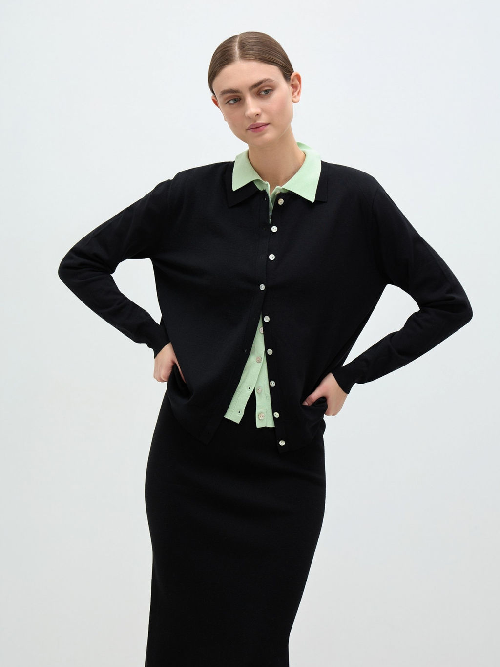Итальянский размер (чтобы получить российский,нужно прибавить 2) Базовый кардиган с отложным воротником актуальная альтернатива рубашке. Та же лаконичность, функциональность и максимальная вариативность стилизации. Модель выполнена из легкого вискозного полотна гладкого плетения, в прямом свободном силуэте. Манжеты и низ оформлены эластичной резинкой. Кардиган застегивается на перламутровые пуговицы, которые делают его еще нежнее и изящнее. 100% вискоза