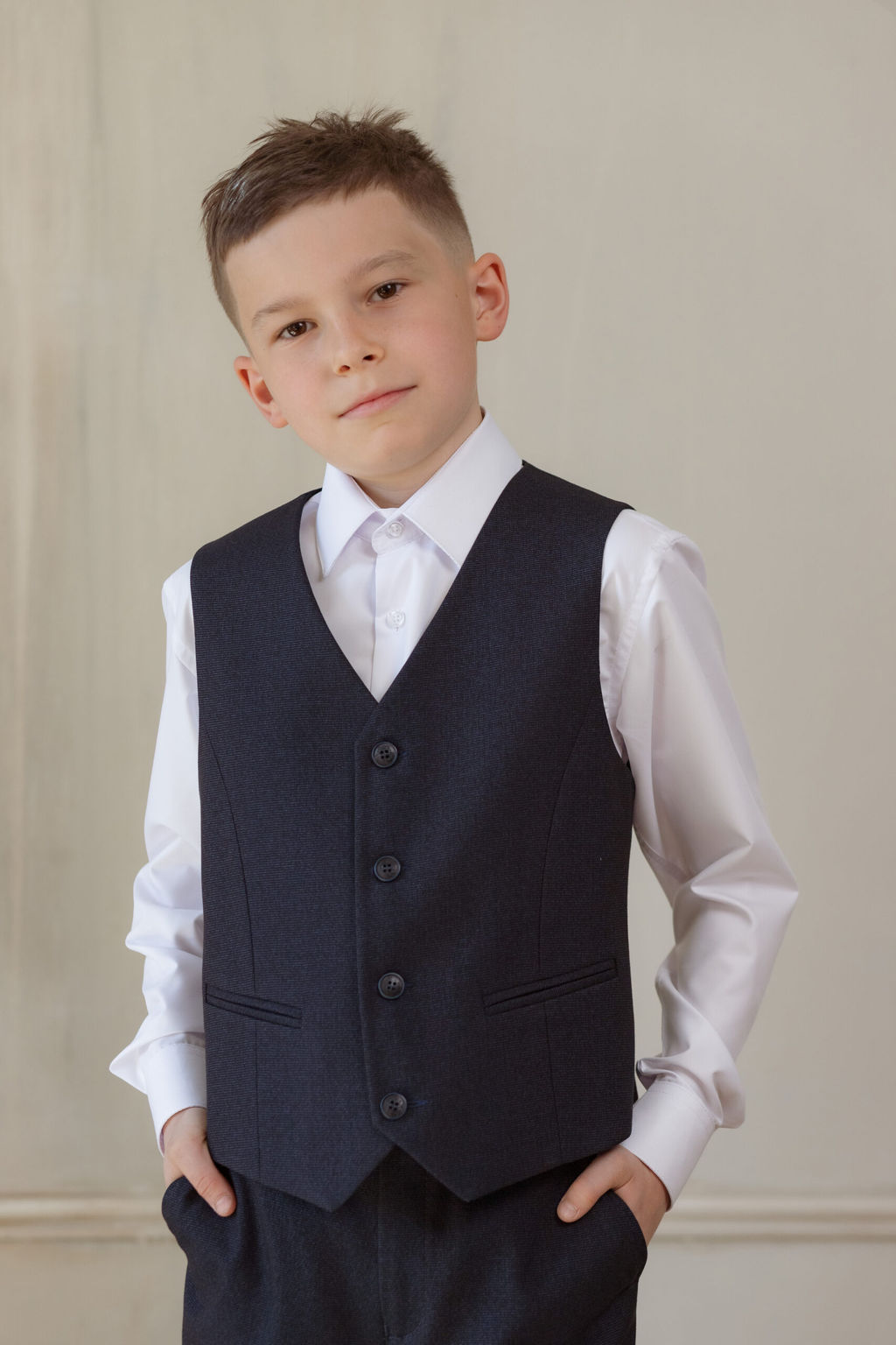 Жилет для мальчика, полуприлегающего силуэта, с застежкой на пять петель. На полочках два прорезных кармана.