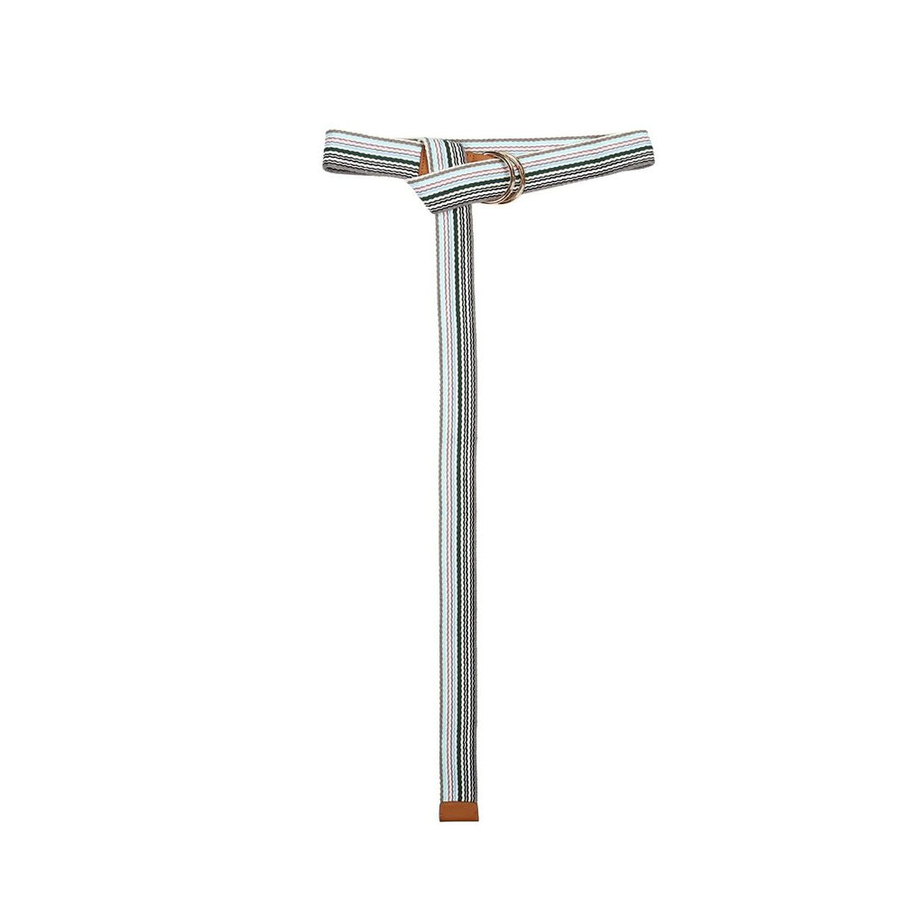 Оригинальный тканевый ремень в полоску. Цвет полосок: серый, голубой, розовый, бежевый, зеленый, черный. Фурнитура золотистого оттенка. Обшит кожей.