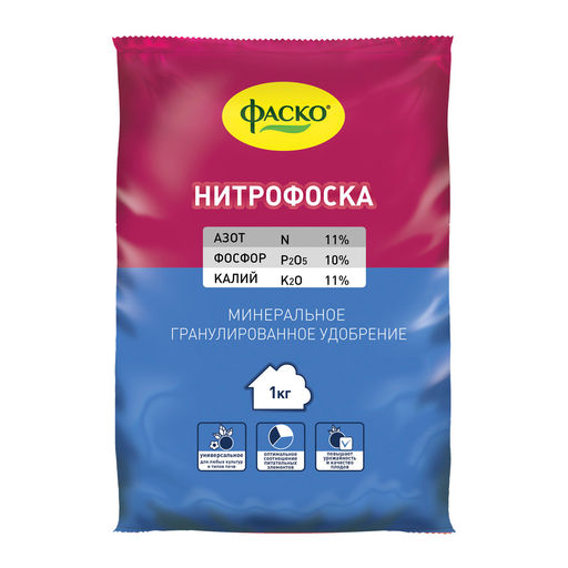 Фаско Нитрофоска сложное азотно-фосфорно-калийное удобрение с уравновешенным содержанием питательных элементов. Применяется для основного внесения и корневой подкормки овощных, плодово-ягодных, декоративных культур. Препарат способствует ускорению созревания и улучшению качества урожая, повышает содержание питательных веществ в плодах, формирует устойчивость к неблагоприятным факторам окружающей среды.