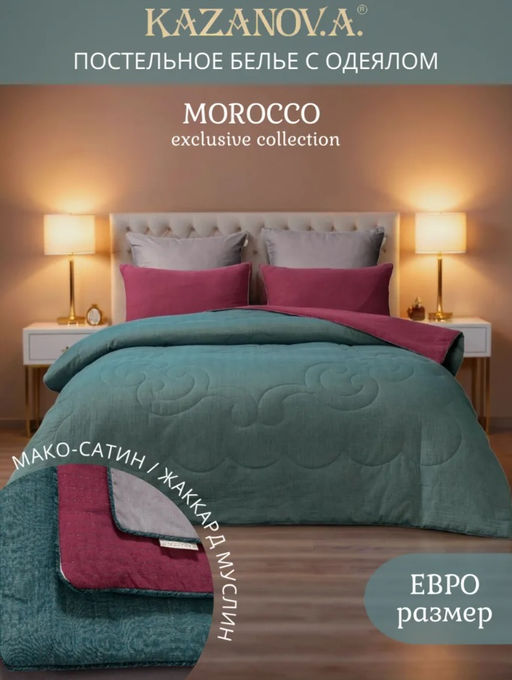 НОВИНКА! Премиальная коллекция MOROCCO от KAZANOV.A. Коллекция MOROCCO выполнена из эксклюзивного жаккардового двухстороннего муслина, изготовленного из лучшего в мире длинноволокнистого 100% хлопка. Особенность жаккардового муслина заключается в том, что нити предварительно окрашиваются по специальной технологии и лишь затем сплетаются в изысканный узор. Благодаря этому цвета не тускнеют со временем, а ткань остаётся невероятно нежной и воздушной. Дизайнерская идея коллекции позволяет менять стиль спальни ежедневно от минимализма до сложной текстильной композиции. Переворачивая одеяло и подушки, вы легко создаёте новые стилистические акценты и обновляете интерьер с минимальными усилиями. Наполнитель в одеяле инновационное Эко-волокно "Микрогель, обеспечивающее превосходную терморегуляцию. Чехол одеяла выполнен из двойного слоя тончайшего жаккардового муслина. Это дарит ощущение воздушной лёгкости. В тёплый весенне-летний сезон двухслойное муслиновое одеяло поддерживает идеальный баланс температур, создавая оптимальный микроклимат для сна. Премиальный статус коллекции подчеркивает элегантная отделкой руликом из шенилла, которая искусно завершает дизайн каждого элемента и придаёт всему комплекту утончённость и изысканность. Коллекция представлена в 3х комплектациях: евро, семейное, полуторное. Роскошная упаковка: Каждый комплект упакован в дизайнерскую коробку, что делает его идеальным выбором для подарка на любое торжество. MOROCCO от KAZANOV.A. коллекция, в которой стиль и практичность идеально сочетаются, превращая ежедневный отдых в изысканное наслаждение. Простынь 230х250см(1шт), Наволочки 50х70см(2шт), 70x70см(2шт), Одеяло 200х220см(1шт)