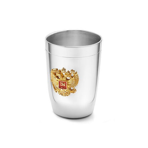 Стопка выполнена в классической форме из серебра высочайшей пробы. Ее украшает державный герб. Отполированная поверхность изделия выгодно подчеркивает позолоченный герб. На его груди находится красный щит, декорированный итальянской красной эмалью, в центре которого расположен серебряный всадник.
