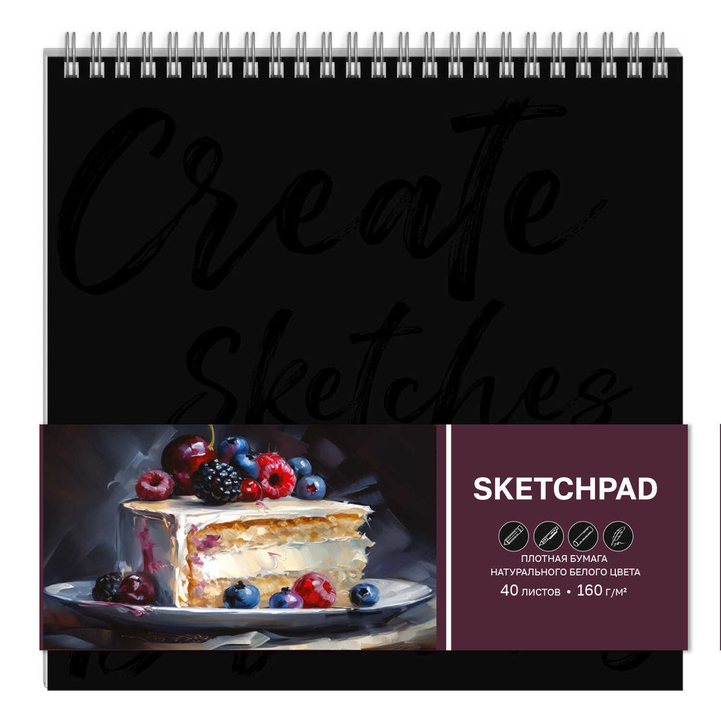 Альбом для рисования (Скетчпад) 210х210 мм, 40 л, блок - белый офсет 160 г/м?, арт. 65415 СЛАДОСТЬ /обложка полноцветная печать, твёрдый переплёт на гребне, матовая ламинация, УФ-лак выборочный /