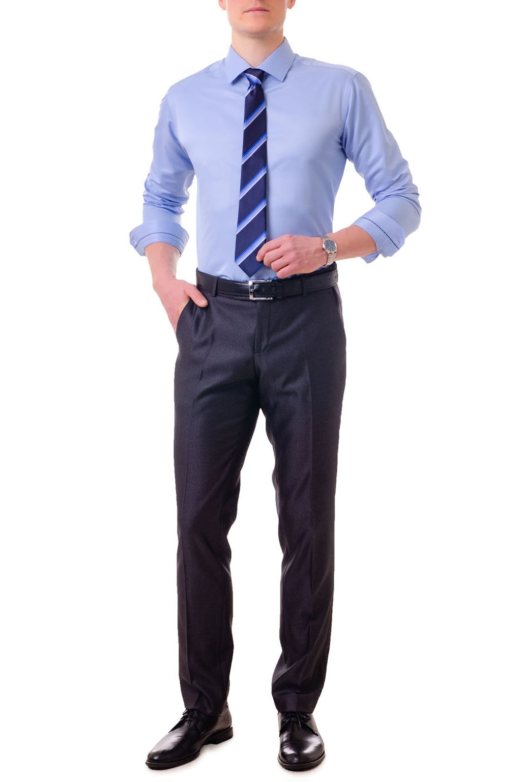 Классическая рубашка насыщенного голубого цвета из сатина с длинным рукавом. По внутренней части ворота и манжета отделка узким кантом из дополнительной ткани. Силуэт полуприталенный.